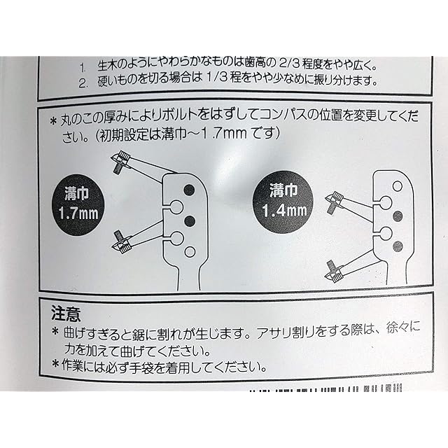 【特長】<br>誰でも簡単に笹刈刃や下刈刃のアサリ割り加工が可能に!<br>刃先にアサリ割りを施すと、木や竹等に対する刃の切断性能が上がります。<br>ただし、熟練の職人による正しく正確な加工でないとかえって危険が伴います。<br>こちらのハンディセットは、上下のネジによって左右のアサリ割りを均一に振り分けることができます。<br>また、通常の1.7mm溝と合わせ、薄刃にも対応可能な1.4mm溝のW仕様。<br><br>【仕様】<br><br><br><br><br><br>