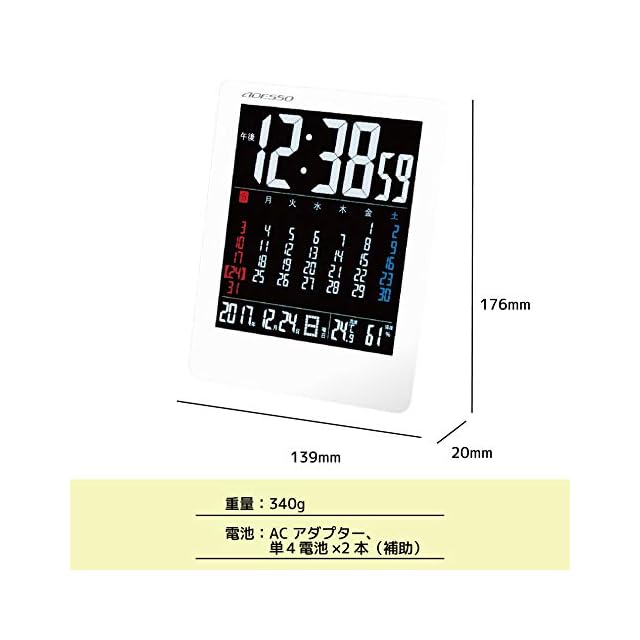 ADESSO(アデッソ) 置き時計 電波 デジタル カラーカレンダー 電波時計 温度 湿度 曜日 日付表示 置き掛け兼用 ホワイト NA-929