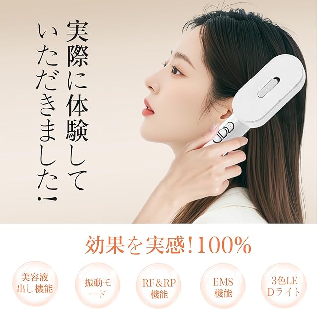 【美容液や頭皮ケア剤注入機能】頭皮ブラシに搭載されたタンクに美容液や頭皮ケア剤を注入し、電源を入れると、ブラシのEMS、R&F、E&PとLEDライトと一緒に使うことで、使用時に均等に流れ出し、頭皮環境をサポート。例えば、朝のスタイリング前や夜のリラックスタイムに、簡単に集中ケアが可能です。