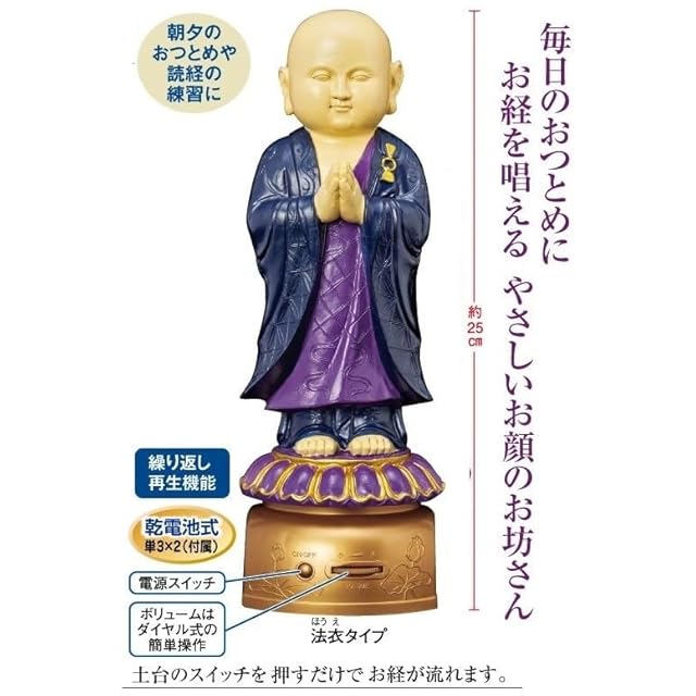 お経を唱える可愛いお坊さん 【我が家のお坊さん】浄土真宗西本願寺 法衣タイプ 毎日のおつとめに!お経を唱えるお坊様人形。 土台のスイッチを押すだけでお経が流れます。実際の僧侶の読経をデジタル収録。お坊さんの手は数珠掛けになっております。 穏やかな表情で飾っておくだけでで癒されます。 組み立て不要