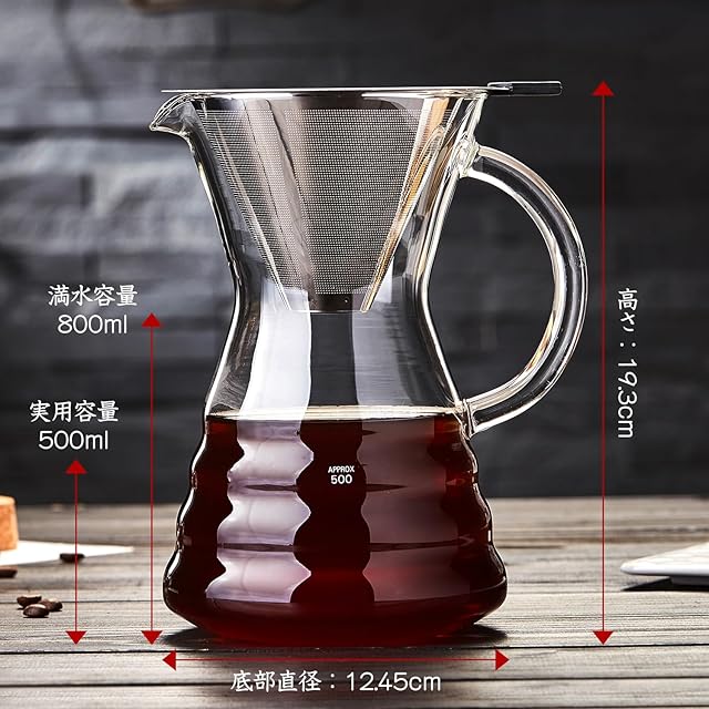 【使いやすさ】:このガラス製コーヒーメーカーは抜群の使い勝手を誇ります。コーヒーサーバーの上にステンレスフィルターを置き、お気に入りのコーヒーを入れて、ゆっくりと回しながらお湯を注ぐだけで美味しいコーヒーを楽しむことができます。しかも、コーヒーサーバーの素材は滑らかなガラスであり、ステンレスフィルターはお手入れも簡単。お掃除の心配も解決されるでしょう。