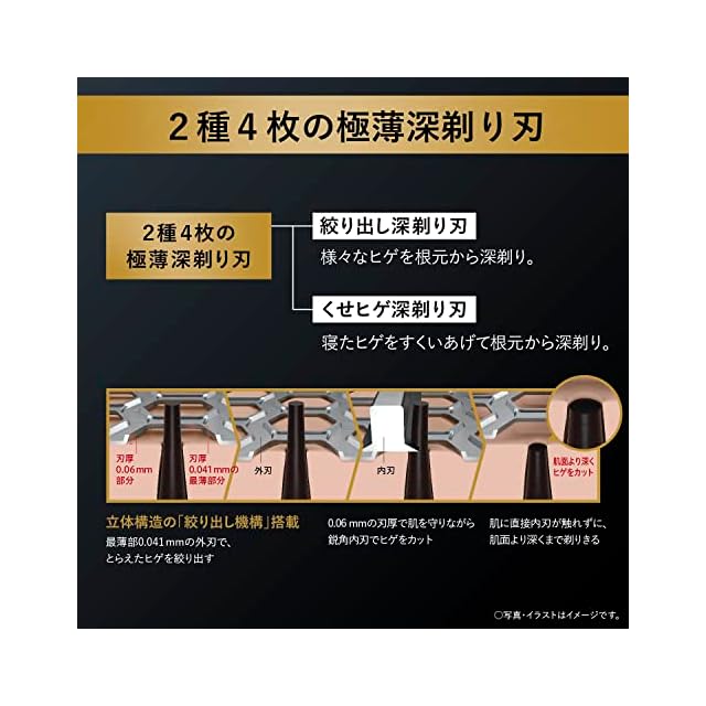 【肌にやさしい】最薄部約0.041 mmの2種4枚の極薄深剃り刃と絞り出し機構で、肌にやさしく、肌面より深くヒゲをカット
