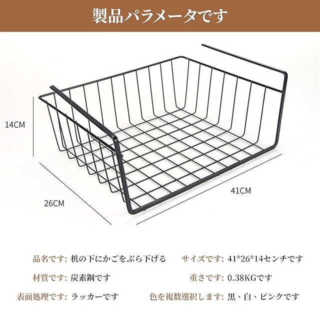 サイズ:41*26*14.5cm<br> カラー:ブラック <br> 耐荷重:5kg。 <br> 厚み0.5~3cmの棚に適用します。<br> 表面処理:焼付け塗装。<br> <br> 吊り戸棚に引っかけるだけ、工具等は一切不要で簡単設置です。<br> 存在感がありつつも、シンプルなデザインは周囲にも優しく溶け込みます。見た目、機能性だけでなく、材質にスチールを使用し、しっかりとした作りも魅力的です。<br> <br> 適用場合:キッチン、教室、寝室、部屋などです。戸棚下のスペースを利用します。綺麗な生活空間を創造します。<br>