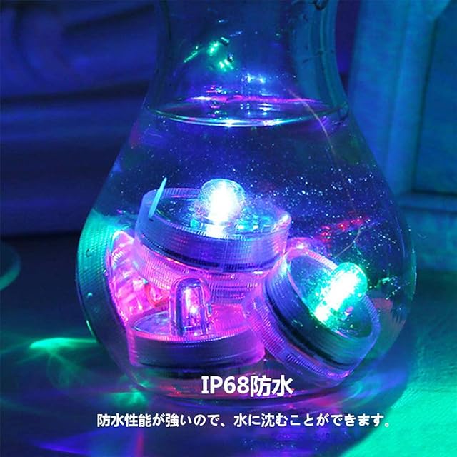 【防水設計】IP68の高い防水レベルの設計なので、屋外の雨、ジメジメな天気なども安心使用できます。<br/><br/><br/>【48時間の高輝度】約48時間の高輝度点灯が可能です。長い間でお客様に雰囲気作りことができます。<br/><br/><br/>【多用途】結婚式、誕生日、パーティーなど時に使用するだけではなく、金魚鉢、花瓶、プール、噴水、水族館等ところでも適用です。<br/><br/><br/>【高い安全性】火を使わないので、これまで火が使えなかった場所でも気兼ねなく炎の「ゆらぎ」を楽しむことができる。小さなお子様やペットと一緒の空間でも安心できます。落ち着く色合いと適当な明るさで、リラックスさせます。本物の炎のようにロマンチックな雰囲気を作られます。<br/><br/><br/>【耐久性】作る材料は素晴らしいABSの素材ですから、落下摩耗など問題はありません。2枚の高輝度フォグLEDランプビーズを使用して、光の色がきれい一方、使用寿命も長いです。<br/><br/><br/>【電池式】大容量のCR20332電池が2枚が付いているから、働く時間は48時間以上にできます。電池式なので、お好みなところへ放置できます。庭園でも、池でも、プールなどのところでも大丈夫です。<br/><br/><br/>【LEDライト】高輝度の霧効果のLEDランプビーズが採用して、照明明かりが柔らかく、明るさもよく、色もきれいで、使用寿命も長いです。各種の色を遅いスピードで変化されます。よりロマンチックな雰囲気を作り出します。<br/><br/><br/>【環境保護省エネ】無炎、無煙、無溶融ワックス、2個のCR2032交換式ボタン電池(付属、設置済み)を搭載し、燃焼リスクはありません、子供やペットにも安心です。<br/><br/><br/>仕様<br/>【ライト】LEDライト<br/>【光色】RGB多色自動変化<br/>【光束】10lm<br/>【入力電圧】DC6v<br/>【サイズ】30*25.4mm<br/>【電池】CR20332 (2枚)<br/>【寿命】48時間 (電池が交換可能)<br/>【工率】0.06w<br/>【素材】ABS<br/>【防水】IP68<br/><br/><br/>付属品<br/>ライト本体(12個)<br/>