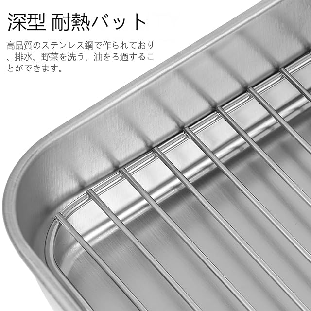 商品名:NUOLUX バット 料理 深型 耐熱 オーブン対応 ステンレス 揚げ物 トレー 23x17x5CM 深型 キッチントレイ 角バット 油切り 網付き 油きり 湯煎焼き用 食洗機対応 ベーキングトレイ 実用トレイ ベーキングディッシュ シルバー