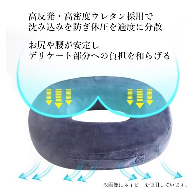 「楕円ドーナツ形状」と「大きな楕円穴」の形状で、患部が座面に触れず、着座が楽になります。