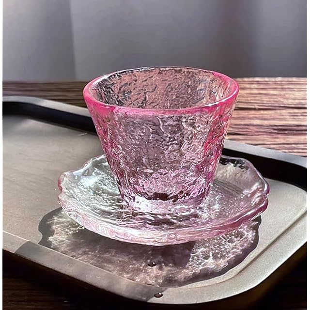MiniMood 冷凍クリスタルタンブラー 4個セット ソーサー付き 耐熱55ml ガラスティーセット テクスチャーガラス製 透明 冷茶専用 洗練されたギフト 茶葉工芸茶対応 コースター付属 (ピンク)