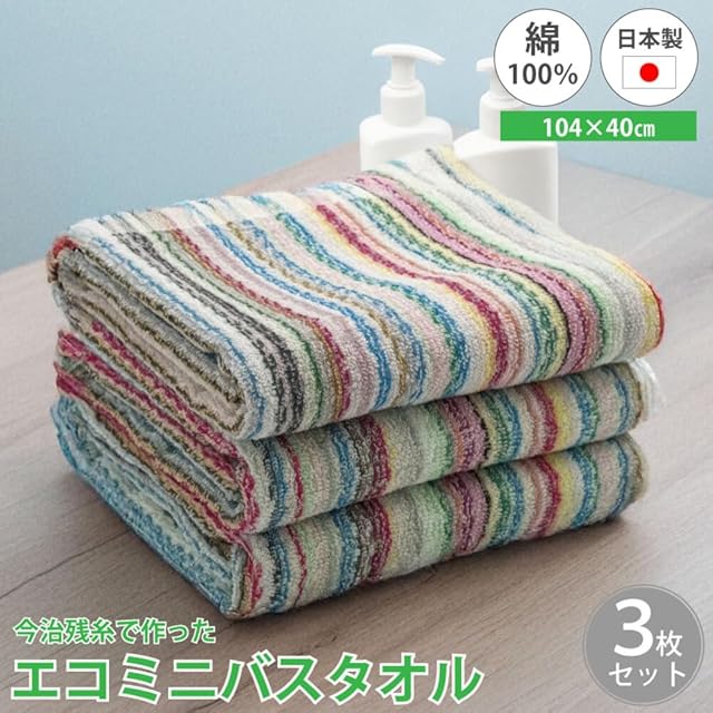 バスタオル 今治タオル ミニバスタオル 3枚組 残糸で作ったタオル エコタオル 日本製 国産 綿100% 肌に優しい 40×104cm 残糸 3枚セット 地球とお財布に優しい 残糸使用 吸水 速乾