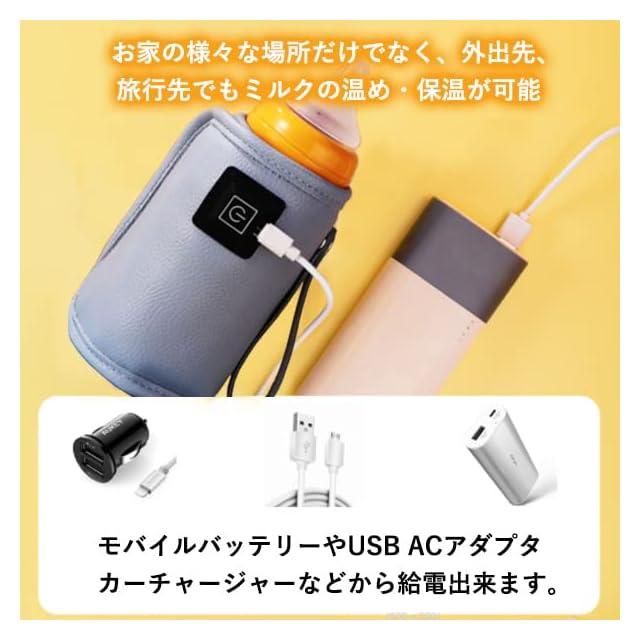 モバイルバッテリーやUSB ACアダプタ、車のシガーチャージャーなどのUSBポートから電源が取れ、お家の様々な場所だけでなくお出かけ、旅行先でもミルクの温め・保温が可能に。