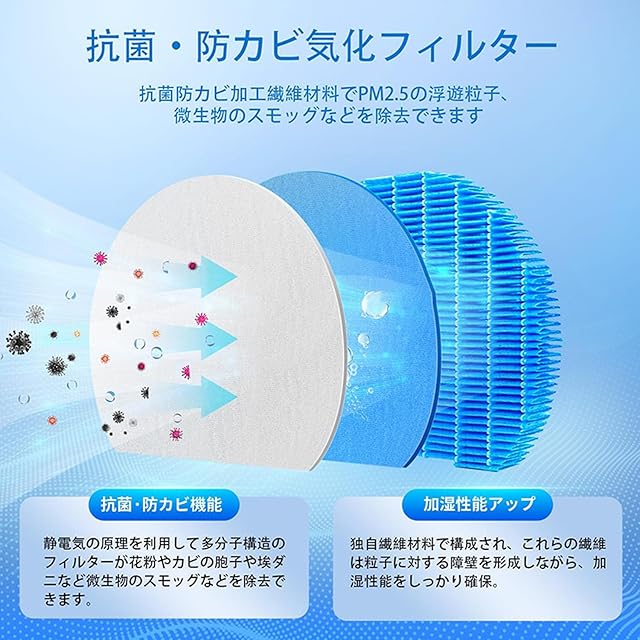 【高質素材】--ポリエチレンテレフタレート材質で作られた加湿器 フィルターは、水垢や黴菌が生えないことを効果的に果たすため、加湿機能と空気中のpm2.5をキャッチする濾過機能を持たせて、大事な呼吸をきちんと守ります。