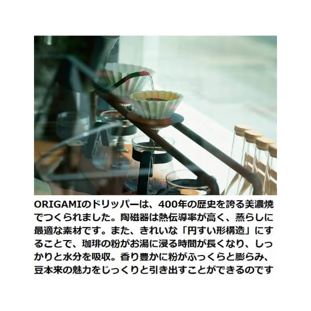 鮮やかなカラーリングと縦溝がまるでオリガミを折ったようにみえるORIGAMIのドリッパーです。 20あるリブ(溝)がドリッパーとペーパーの間に空間を作ることでお湯の抜けをスムーズにし、多彩な抽出を表現。