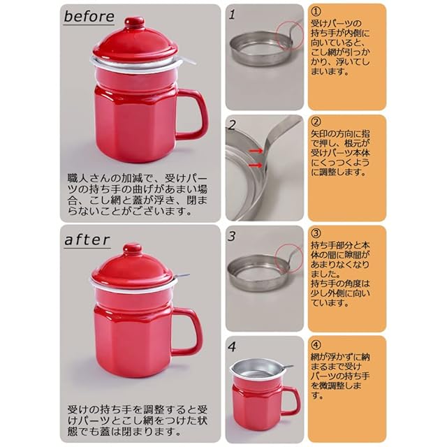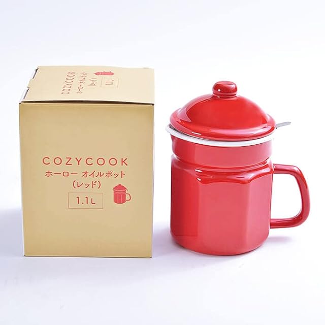 レトロかわいいホーローのオイルポット。<br> 鮮やかな赤色のオイルポットです。<br> ホーローのオイルポットなので、酸や塩分に強く、においも付きにくく、また、色が移らず雑菌が繁殖しにくく衛生的。<br> 汚れも落としやすいので、片付けもラクラク。<br> また、別売品の交換カートリッジを使用することで不純物をろ過し、においや色もカートリッジが吸着します。 <br> ※ホーローは衝撃を与えると割れやすいため、お取り扱いはやさしくお願いいたします。 <br><br> 【ブランド】コージークック(CozyCook)<br> 【内容】容器本体、こしアミ、フタ<br> 【材質】容器本体、フタ:ほうろう用鋼板(底の厚さ 0.8mm、蓋の厚さ 0.6mm)、こしアミ:ステンレス鋼<br> 【表面加工】ホーロー(ほうろう)<br> 【容量】適正容量:約1100ml(満水容量:約1500ml)<br> (別売品)交換カートリッジ使用時<br> 適正容量:約700ml(満水容量:約1300ml)<br> 【重量】約710g<br> 【オイルポット本体 サイズ】<br> 直径(本体上部):約125mm(注ぎ口含む:約135mm)、底面:直径約115mm<br> 高さ:約135mm<br> 幅(取っ手含む):約180mm<br> 【オイルポット フタ】<br> 直径:約125mm<br> 高さ(突起物含む):約65mm<br> 【こし網 サイズ】<br> 直径:約90mm(最大約115mm)<br> 高さ:35mm<br> 【生産国】中国