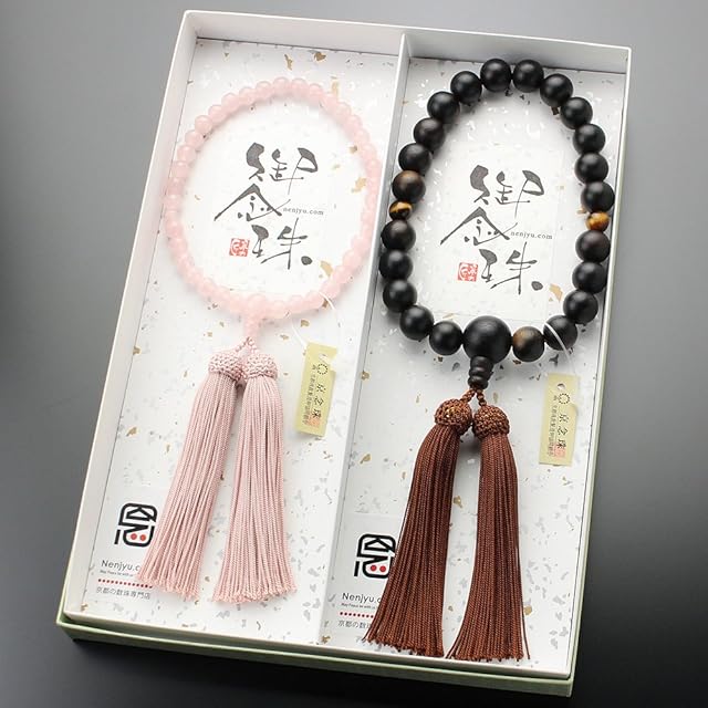 念珠ドットコム ≪ペア数珠≫ 数珠 男性用(22玉 縞黒檀 虎目石 正絹房)・数珠 女性用(約7ミリ ローズクォーツ 正絹房)ペアセット 京念珠 念誦 略式 法事 葬儀 葬式 法要 天然石 夫婦お揃い ギフト 2000500100314 数珠袋プレゼント!