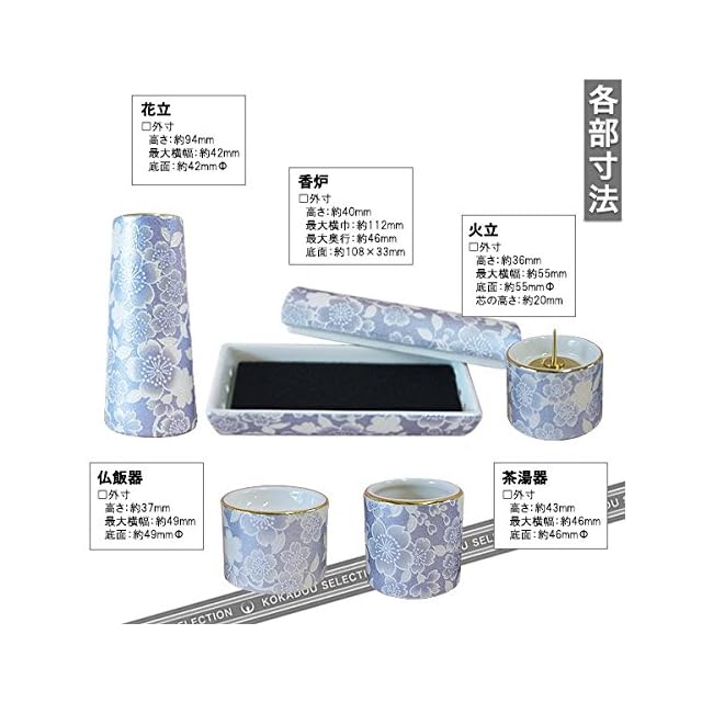 サイズ(㎝) 湯呑:高4.3×径4.4 仏飯器:高3.6×径4.8 ローソク立:高3.6×径5.4 花瓶:高9.3×径4.1 香炉:高4×巾11×奥行4.5