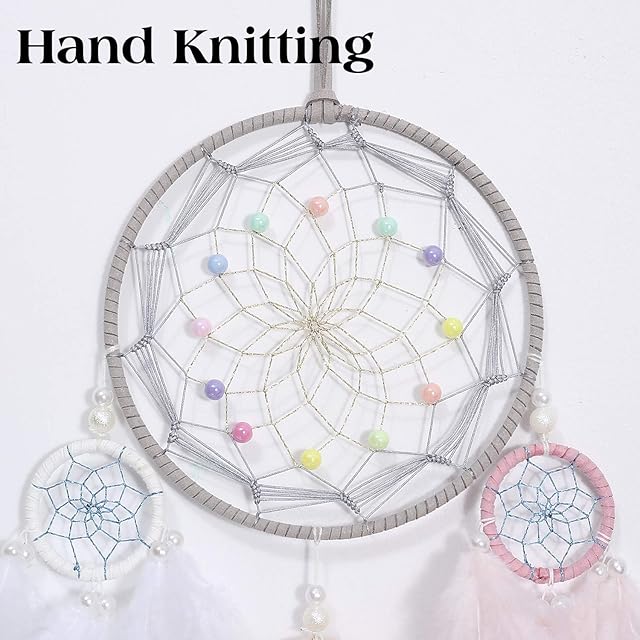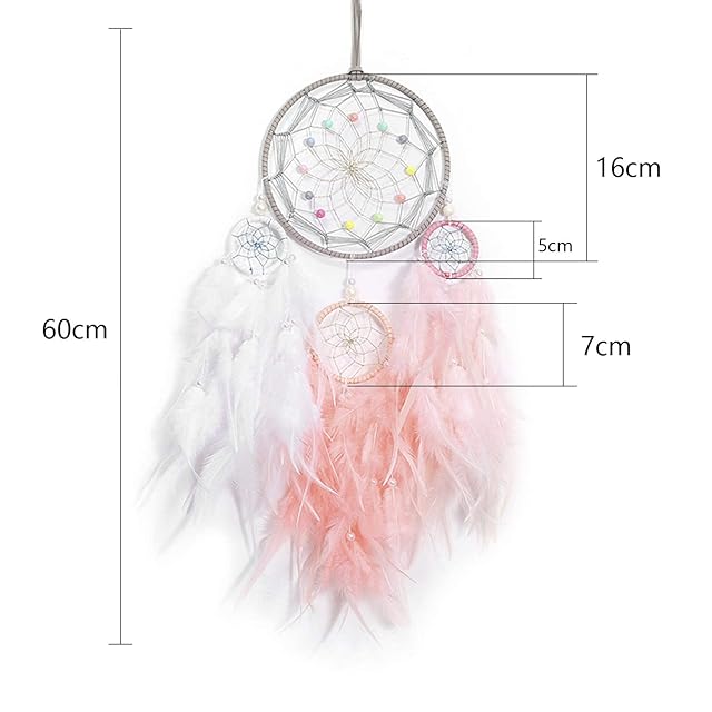 Keponbee ドリームキャッチャー 女の子用 ピンク ハンドメイド ロマンチック ユニーク ドリームキャッチャー ビーズと羽根 壁掛けオーナメント 寝室用ギフト