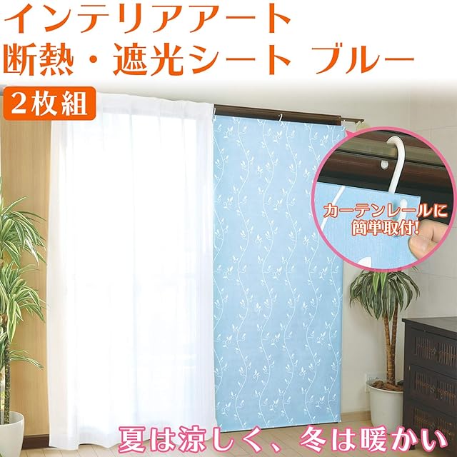 商品名:窓用 断熱・遮光カーテン 遮光率100% 2枚組 リーフ柄 ブルー‐アルミ カーテン 遮光シート カーテンレール 遮光カーテン 断熱シート 遮光シート 窓