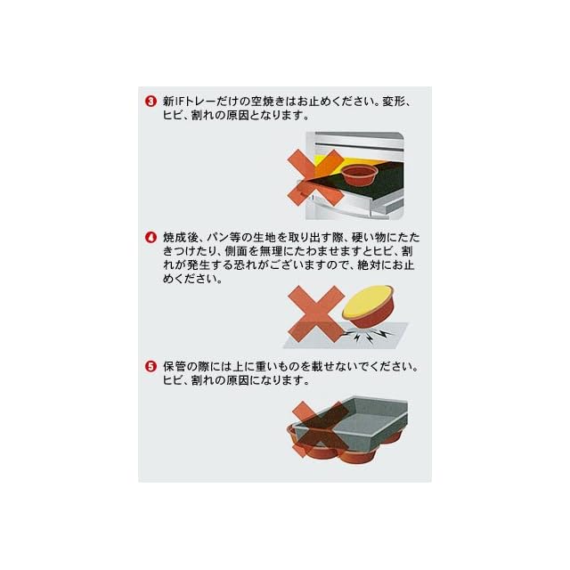 使用上の注意:直火及びオーブントースターでのご使用は出来ません。火災の恐れがありますので絶対にお止めください。 新IFトレーだけの空焼きはお止めください。変形、ヒビ、割れの原因となります。 焼成後、パン等の生地を取り出す際、硬い物にたたきつけたり、側面を無理にたわませますとヒビ、割れが発生する恐れがございますので、絶対にお止めください。 保管の際には上に重いものを載せないでください。ヒビ、割れの原因になります。