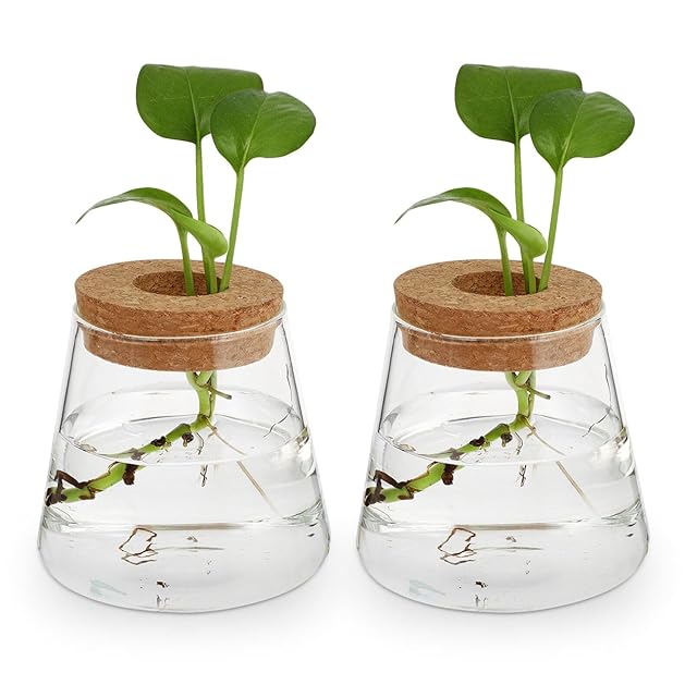 Kichvoe 水耕栽培 ガラス花瓶 2個セット おしゃれ 花瓶 小さい卓上装飾 木製蓋付き フラワーベース 透明 ガラス容器 家庭 オフィス用