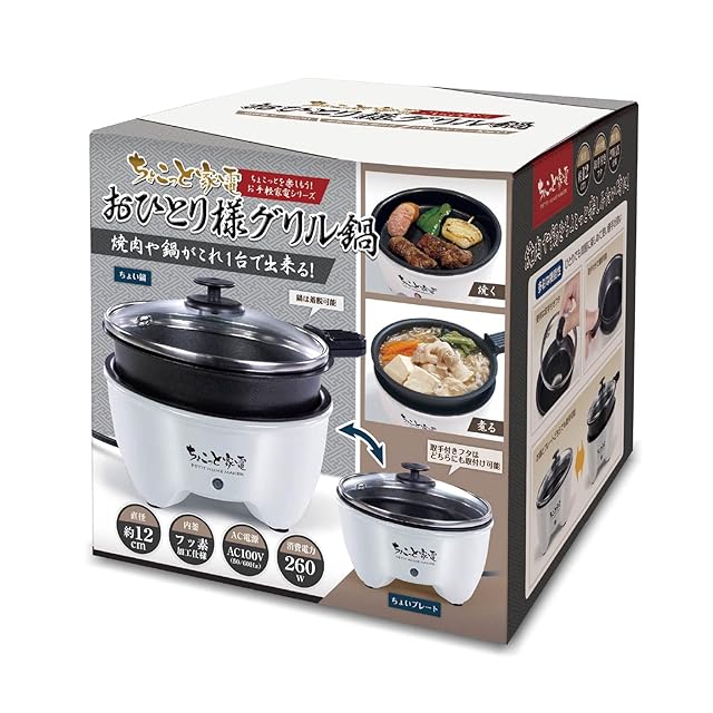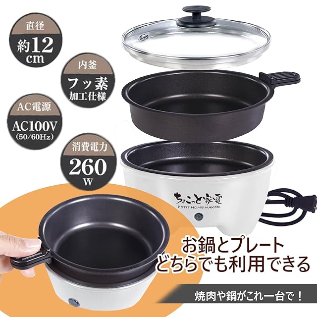 [東京Deco] 電気鍋 グリル鍋 ホットプレート 1人用 直径12cm [鍋も焼肉もこの1台で楽しめる] グリルプレートセット コンパクトサイズ 着脱式 鍋プレート&グリルプレート付 ひとり暮らし用 260w ガラス蓋付き ホワイト h019