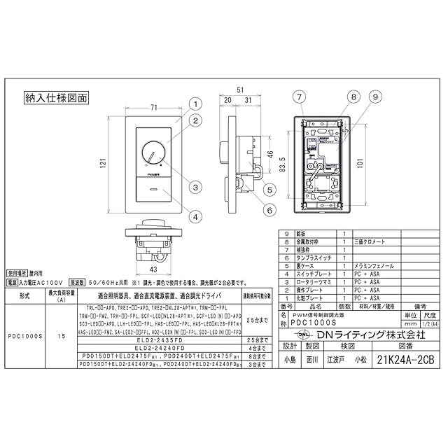 メーカー: DNL / DNライティング (旧ダイア蛍光 DAIA 旧ニッポ電機 NIPPO) <br/> シリーズ名:PWM信号制御調光器<br/> <br/> シームレスライン、シームレススリム、DNLED's用<br/> 1個用スイッチボックス(カバー付)に適合(JISC8340)<br/> 定格容量:15A<br/> 周波数:50/60Hz共用<br/> 入力電圧:100V<br/> 屋内用
