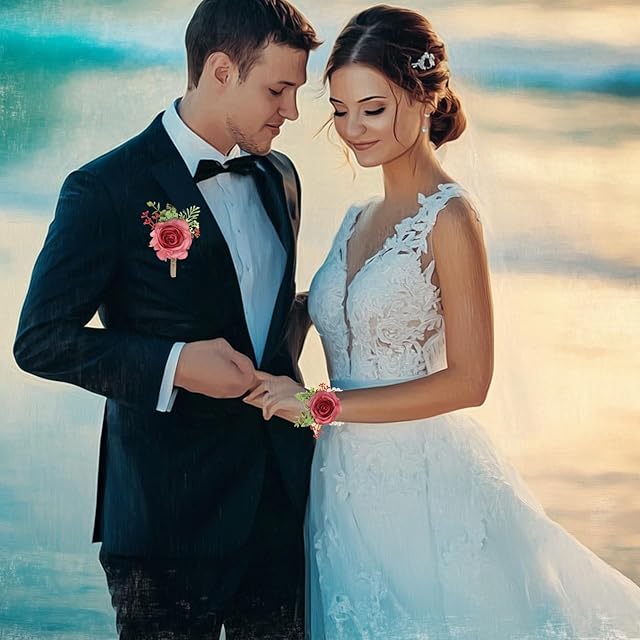 取扱説明:ブートニアには裏側にピンとクリップが付いており、着用が簡単です。コサージュには調節可能なブレスレットが付いており、ほとんどのサイズにフィットします。