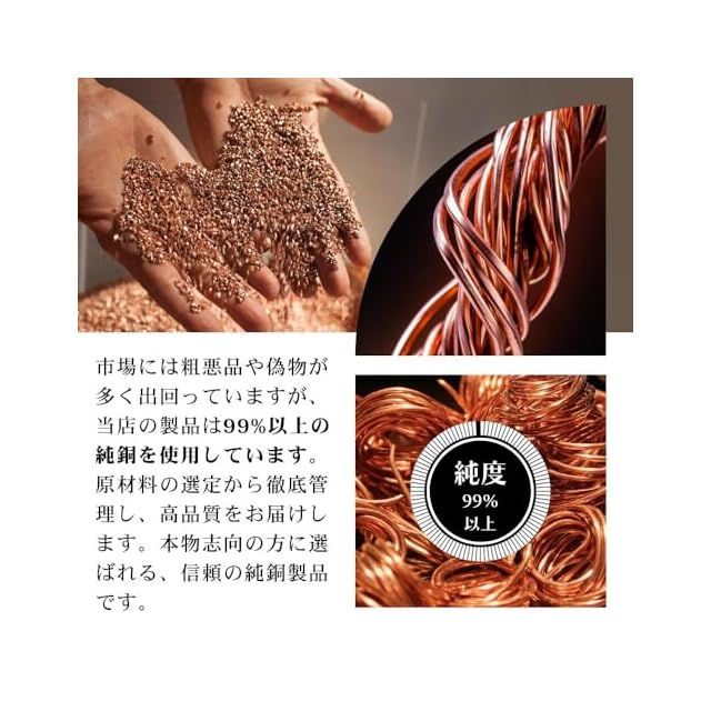 銅には抗菌性があり、水を長期間新鮮な状態に保ち、細菌の繁殖を抑えることができます。さらに、銅イオンは水に溶け出し、体内の不純物を浄化する効果があります。これにより、消化器系の健康や免疫力の向上などに役立つとされています。