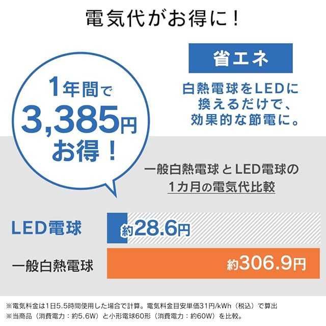 電源:交流 100V(50/60Hz共用)●使用場所:屋内用●ランプ全体の明るさ:小形電球60形相当●エネルギー消費効率:135.7lm/W