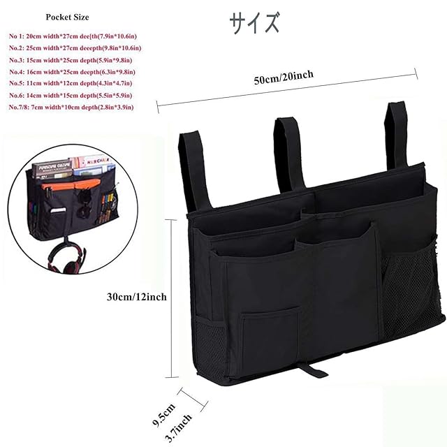 Longbest ベッドサイドポケット 吊り下げ収納袋 ウォールポケット厚手オックスフォードクロス製 寝室ベッド収納 大容量収納ポケット小物入れ 8ポケット 病院ベッド乳母車 ベビーベッド 椅子 ベッド車の座席兼用 (ブラック)