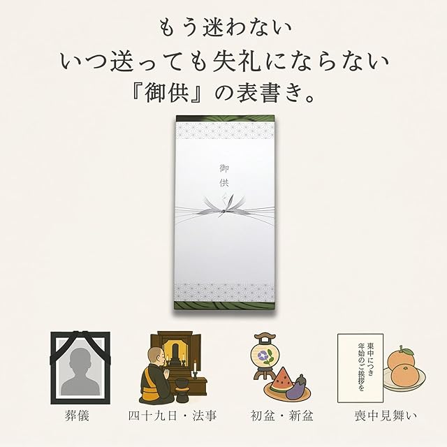 ■ 使用シーン ・全宗派および全仏事でお使いいただけます。 ・四十九日/一周忌/三回忌などの法要 ・葬儀/お盆/初盆/お彼岸のお供え ・年末のご挨拶や、喪中見舞いの贈り物にも最適