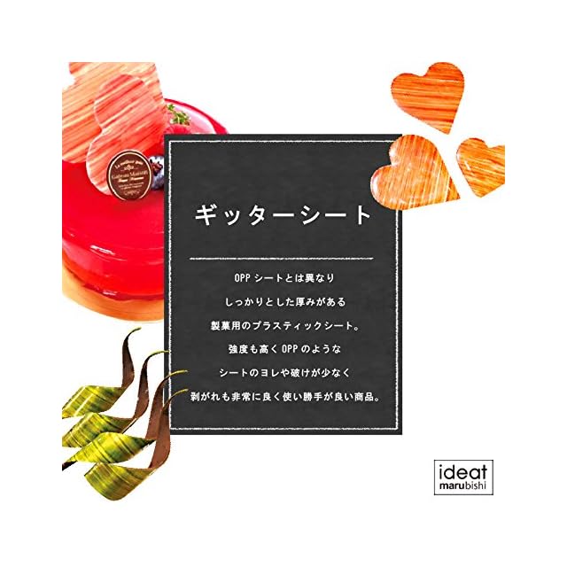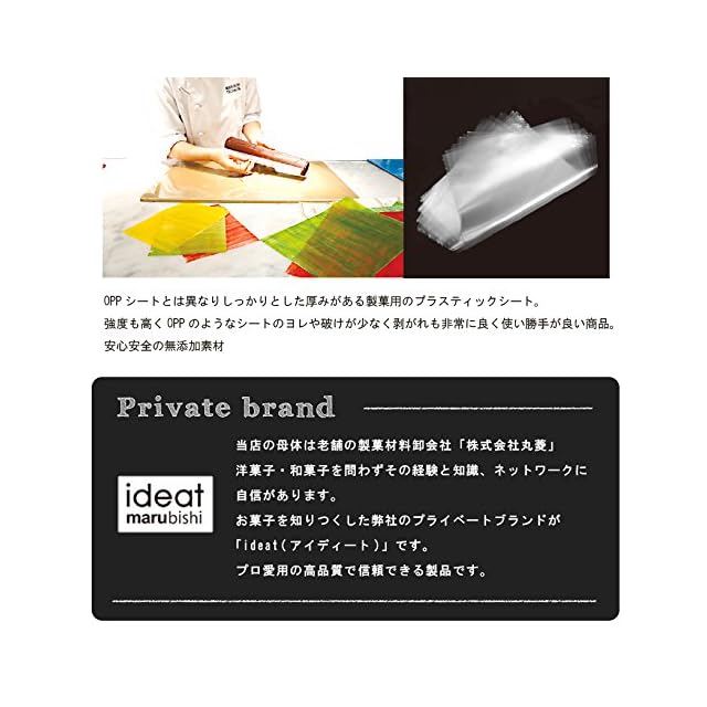 OPPシートとは異なりしっかりとした厚みがある製菓用のプラスティックシートです。<br /> 強度も高くOPPのようなシートのヨレや破けが少なく剥がれも非常に良く使い勝手が良い商品で、安心安全の無添加素材です。<br /> ■自慢のプライベートブランド<br /> 老舗の製菓材料卸会社「株式会社丸菱」のプライベートブランドです。<br /> 洋菓子・和菓子を問わずその経験と知識、ネットワークに自信があります。<br /> お菓子を知り尽くしたプライベートブランドが「ideat(アイディート)」です。<br /> プロ愛用の高品質で信頼できる製品です。<br /> ■サイズ<br /> 290mm×380mm<br /> ■内容量<br /> 100枚<br />