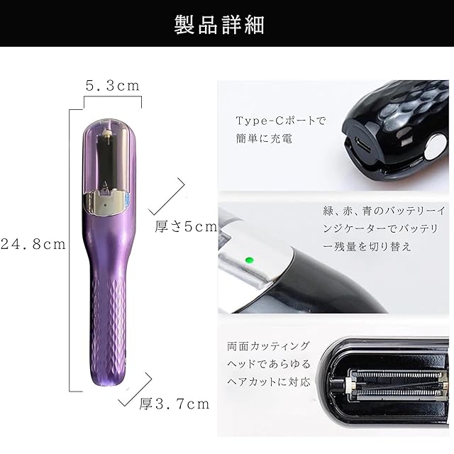 1セット:パープル:マシンサイズ:24.8*5.3*5cmより安定した健康的で美しい髪を実現するには、トリマーバディで傷んで切れた毛先をトリミングし、より柔らかく自然な輝きのメリットをお楽しみください。
