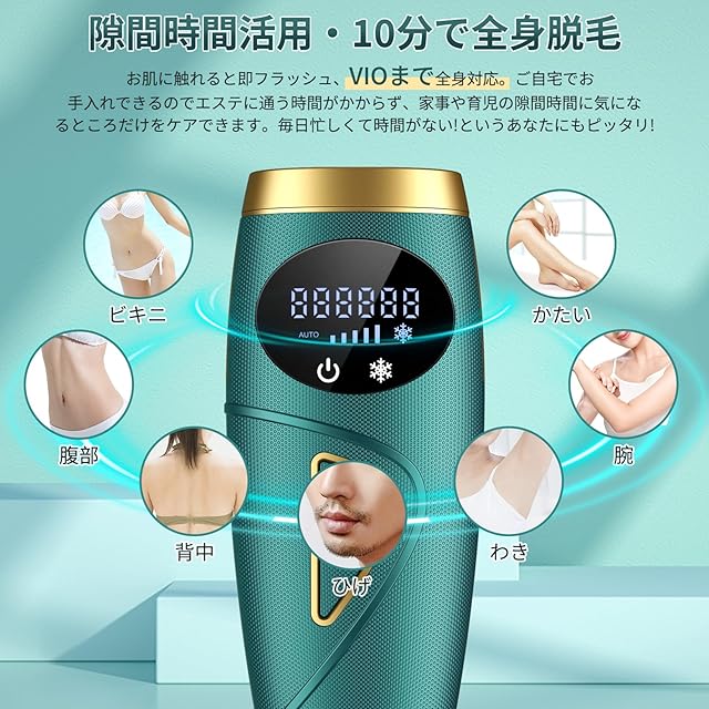 サファイア冷感脱毛器:この冷感脱毛器はサファイア冷却機能を搭載し、平らなサファイアヘッドがお肌にピッタリ密着して、瞬間に肌表面の温度を10℃前後に冷やすことで高いエネルギーの照射光による灼熱感から脱却し、無痛脱毛を実現します。敏感肌でお悩みの女性におすすめです。ムダ毛の悩みから解放し、自信のついた毎日を楽しみましょう!女性だけでなく、太く濃い男性の髭脱毛にもご使用できます。