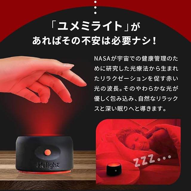 商品名:赤色光 ライト 睡眠 安眠 快眠 【ユメミライト】休息の質向上 NASAの技術 630~670nm ギフト ナイトライト ベッドサイド 照明 コンパクト リラックス 自動消灯 Helight プレゼント 睡眠用 ホワイトノイズ 寝室 睡眠導入 特許取得 光技術 静音設計