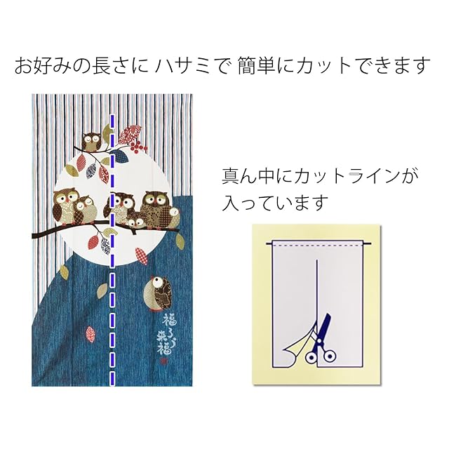 防炎加工が施されている、のれん。<BR> 安全のために防炎加工が義務付けられている、飲食店や公共の施設でもご利用いただけます。<BR> 消防法に定められた「防炎性能基準」をクリアした証明の防炎ラベル(ネーム)は裏側上部に縫い付けられています。 <BR> もちろん家庭用としても!<BR> <BR> 福来郎(福が来る)」「福老(幸せに年をとる)」など縁起が良いふくろう柄でプレゼントとしても喜ばれます。<BR> <BR> お好みの長さにハサミで、簡単にカットできます。<BR> (中央にカットラインが入っています)<BR> <BR> 直径2cm程度までののれん棒・突っ張り棒(テンションポール)に対応。<BR> (のれん棒・突っ張り棒は付属していません)<BR> <BR> 程よく透け感のあるタイプ。<BR> (完全な目隠しにはなりません) 完全な目隠しにはなりません。<BR> <BR> ●商品サイズ/幅(巾):約82cm 高さ(丈):約150cm<BR> ●組成/ポリエステル100%<BR> ●防炎加工<BR> ●中国製<BR>
