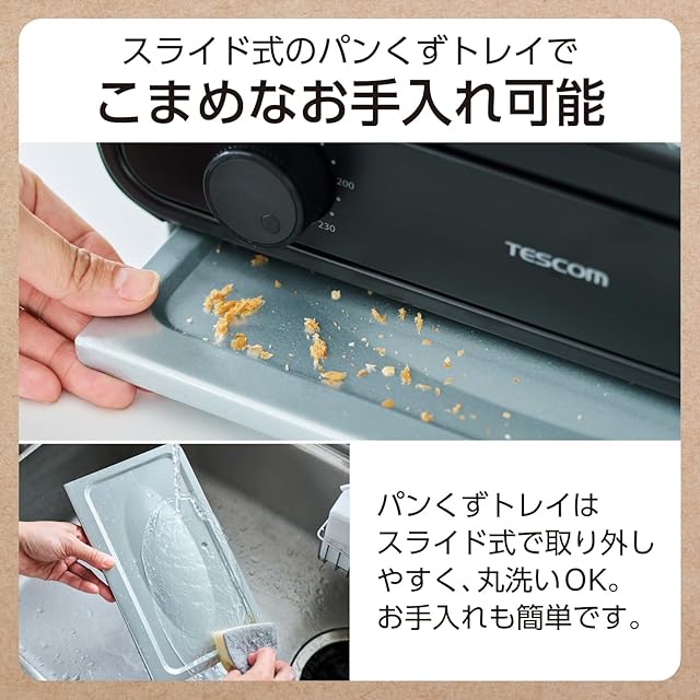 パンくずトレイはスライド式で取り外しやすく、丸洗いOK。お手入れも簡単です。