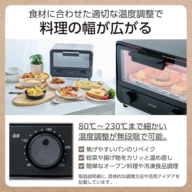 <b>【 仕様 】</b><br>■電源:AC100V 50/60Hz<br>■消費電力:1000W<br>■容量:トースト2枚サイズ<br>■外形寸法:幅約313mm×奥行約241mm×高さ約230mm<br>■質量:約2.8㎏(本体のみ)<br>■庫内寸法:幅約265mm×奥行約180mm<br>■主材料:本体:SPCC(粉体塗装)、ハンドル:PBT、ドア:強化ガラス、つまみ:PA・ABS<br>■カラー:ブラック<br>■コード長:約1.0m<br>■温度設定範囲:80~230℃(無段階調整)<br>■タイマー:15分<br>■海外使用:×<br>■付属品:天板<br>■パーツ:天板(TA033918)、パンくずトレイ(TA033925)<br>■期間:1年間<br><br><b>【 説明 】</b><br>■食パンのトーストはもちろん、クロワッサンや総菜パンも焦げずにふっくらと仕上がり、新生活にも便利です。デリバリー品のファストフードや冷凍食品を簡単にリベイクし、さらに美味しくすることもできます。<br>■限られたスペースでも設置可能なコンパクト設計。トーストが2枚入るサイズなのに、ワンルームのキッチンにもすっきり収まるサイズです。<br>■1000Wのハイパワーで、トースト2枚を3分30秒でサクふわ食感に焼き上げます。タイマーと温度調整のシンプルな操作で、説明書がなくても直感的に使えます。<br>■80℃~230℃まで細かい温度調整が無段階で可能。低温から高温まで、食材に合わせた適切な調理ができます。レシピサイトに掲載されている通りの温度に設定できるから、料理のレパートリーも広がります。<br>■パンくずトレイはスライド式で取り外しやすく、丸洗いOK。お手入れも簡単です。<br>■具体的な調理方法や活用アイデアを記載!取扱説明書もぜひご覧ください。おすすめのメニュー例)トースト・ピザトースト/クロワッサンなどの焦げやすいパン/グラタン/焼きおにぎりなどの冷凍食品/唐揚げ・とんかつ・フライドポテトのリベイク/餅<br><br><b>【商品に関するお問い合わせ】</b><br>テスコムホームページよりご確認ください