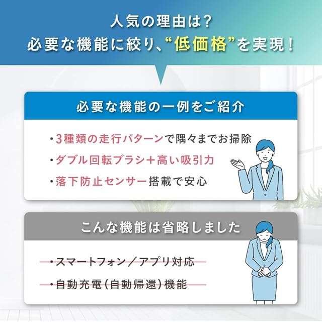 3種類の走行パターン(らせん走行、壁沿い走行、田の字走行)で部屋中の隅々までお掃除。ダブル回転ブラシ+高い吸引力。落下防止センサー搭載で安心。