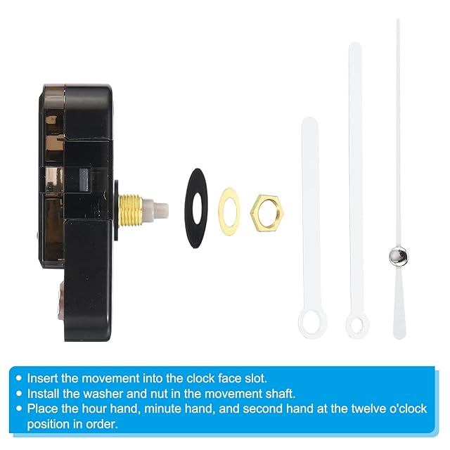 取扱説明書:1. ムーブメントを時計フェースのスロットに挿入します。2. ムーブメントシャフトにワッシャーとナットを取り付けます。3. 時針、分針、秒針を順番に12時の位置に配置します。