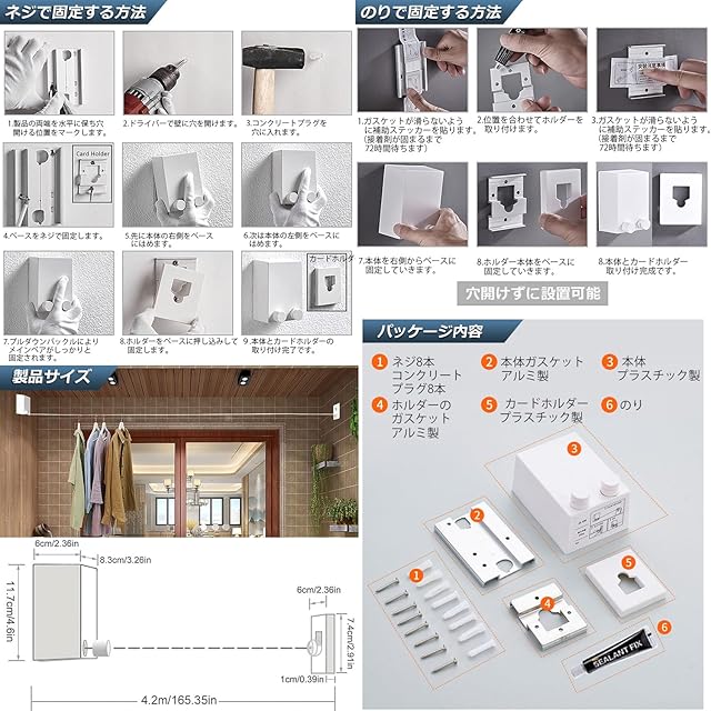 【梅雨対策】<br>雨・雪・花粉・スモッグなどの憂鬱な天候や梅雨季節と<br>台風の日でも楽に洗濯を干すことができます。<br><br>【自由伸縮】<br>自由に伸縮可能で使いやすいし、屋内でスペースをとらない利点があります。誤って手放すと、物干しロープがゆっくりと均等に引き込まれ、けがをしません。<br><br>【二重保護】U字型バックルとロータリースイッチでロックするので、<br>二重保護があり、脱落防止できます。<br>また、ワイヤーを引く時にはしっかりロックができるので<br>お子様やご年配の方がいるご家庭でも安心してお使いいただけます。<br><br>【強度耐久性向上】<br>49本のSUS304ステンレススチールで作られた高強度のワイヤーです。<br>強靭で耐摩耗性に優れ、錆にくい優れものです。<br><br>【操作簡単】<br>壁に穴を開けても、開けなくても取り付けることができます。<br>穴を開けずに接着剤での取り付けができるので、壁を傷付けずお引越しも楽々です。<br>室内だけでなく、屋外でも使えます。<br><br>