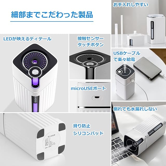 【静音コンプレッサー採用】動作音は約35dBの静音設計です。睡眠中も音が気になりにくく、しっかり噴霧を行えます。【上部給水型】 蓋を開けて上から簡単に給水できます。【水漏れ防止】 水漏れ防止仕様なので、加湿器が倒れても水はこぼれません。【次亜塩素酸水対応】 50ppm以下の次亜塩素酸水を使用することができます。