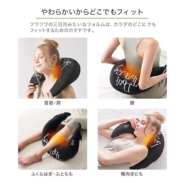 【やわらかいから どこでもフィット 】フワフワの三日月みたいなフォルムは、カラダの どこにでも(首筋、肩、腰、ふくらはぎ、ふともも)フィットするためのカタチです。