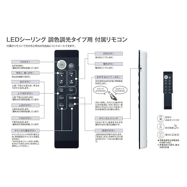メーカー:DAIKO/大光電機 シリーズ名:LEDシーリング 調色調光タイプ用 付属リモコン ■壁掛収納ボックス付 ■操作距離3m 電池(単四形乾電池 2本)付。必ず本体品番(対象商品品番)をご確認ください。 対象本体品番 DPN-40985、DPN-40983、DPN-40984、DPN-40991、DPN-40989、DPN-40990、DPN-40973、DPN-40971、DPN-40972、DPN-40979、DPN-40977、DPN-40978DCL-40988、DCL-40986、DCL-40987、DCL-40994、DCL-40992、DCL-40993、DCL-40976、DCL-40974、DCL-40975、DCL-40982、DCL-40980、DCL-40981