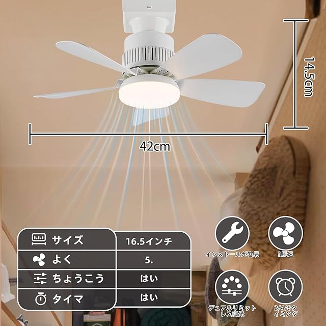 商品名:ソケット式ライトファン リモコン付き(ペアリングが必要です)|E26/E27ソケット専用 小型シーリングファンライト|強力ターボ送風・静音設計・メモリー機能・調光対応(最大1000LM・CRI 80+)|寝室・書斎・ガレージ・ワンルームに最適