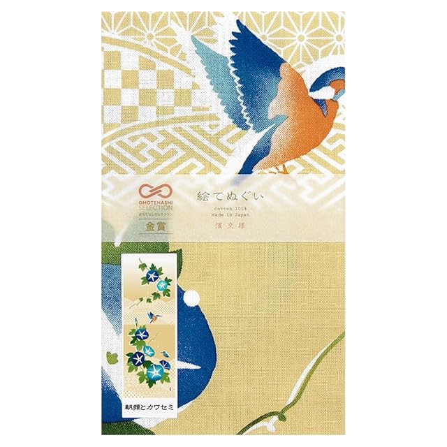 【朝顔とカワセミ】<br> 朝露かがやく朝顔と、色鮮やかなカワセミの共演。<br> <br> 【絵てぬぐい】<br> 1枚の絵としてお飾りいただける「絵てぬぐい」は、<br> てぬぐいとしてはもちろん、季節感あふれるインテリアとしても好評です。<br> 横浜の粋と遊び心を持つ濱文様らしさに溢れた「絵てぬぐい」を是非お楽しみください。<br> <br> ◆素材:綿100% (厳選した木綿生地を採用しています)<br> ◆サイズ:約34cm×90cm (布の伸縮により多少の誤差があります)<br> <br> 【製品仕様】<br> ・横浜伝統の型染め手法である ”捺染 (なっせん)” でお作りしています。<br> ・柄のプリントは片面 (表) のみとなっております。<br> ・端を縫わない ”切りっぱなし” 仕様の、昔ながらのてぬぐいです。<br> ・ほつれは自然と止まりますので、適宜ハサミでカットしながらお使いください。<br> <br> 【注意事項】<br> ・色合いはご覧頂く環境によって印象が異なる場合があります。<br> ・濃色は色落ちする場合がありますので、単独での手洗いを推奨しております。<br> ・塩素系漂白剤はご使用にならないようお願いします。<br> ・濡れたまま重ね合わせたりすると色が滲む場合がありますのでご注意ください。<br> ・素材の特性上、洗濯をすると多少縮みます。<br> ・額装する場合は水通しせず、アイロンと霧吹きでシワを伸ばしてお飾りください。<br> <br> 【ブランド】<br> 横浜のテキスタイルブランド「濱文様」(はまもんよう) は、<br> 横浜伝統の型染め手法である ”捺染 (なっせん)” で染め上げた色あざやかな「てぬぐい」や<br> 風呂敷・タオル・ハンカチなどを中心に、数多くの和雑貨を企画・製造・販売しています。<br> <br> 遊び心のある個性的なデザインが特徴で、<br> 四季折々の風情を感じさせるオリジナルデザインを発信し続けています。<br>