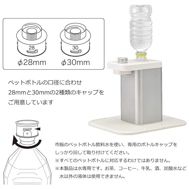 【 仕 様 】■ 定格電圧:AC100V 50/60Hz■ 定格消費電力:1300W■ 待機消費電力:0.5W■ 本体寸法:(約)幅200×高さ192×奥行237mm(台座含む)■ 質量:約820g■ ペットボトル対応容量:2Lまで■ ペットボトル対応口径:28mm、30mm■ 付属品:φ28mm専用ボトルキャップ×1個、φ30mm専用ボトルキャップ×1個、台座×1セット、本体固定ねじ×1個、書付取扱説明書■ コード長:約1.2m