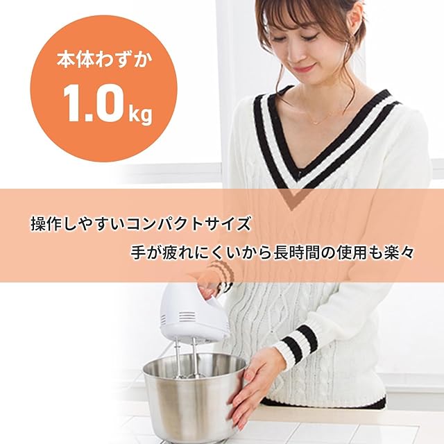 料理の幅が広がる!【2wayパーフェクトミキサー】<br><br>クッキーやホットケーキなどのお菓子作り・ハンバーグの種やパンの生地作りなど、様々な場面で大活躍!<br>本体をスタンドにセットすればハンズフリーでも。/本体を取り外してハンドミキサーとしても。使用できる便利な2wayタイプ♪<br><br>▼電動ミキサーで簡単操作<br>これ1台で「混ぜる」「泡立てる」「こねる」の作業が可能!<br>ドレッシング・ハンバーグ・ホットケーキ・生クリーム・ケーキ・生地作りなど、大変な料理の下ごしらえも電動なので楽に行えます。<br><br>▼2つのアタッチメントで使い分け<br>beaterは「混ぜる」機能、kneaderは「こねる」機能が可能です。<br>beater(ビーター):生クリームやカスタード・メレンゲなどの泡立てに便利なアタッチメント<br>kneader(ニーダー):パンやクッキーなどの生地を作るのに便利なアタッチメント<br><br>▼5段階のスピード調整機能<br>5段階のスピード調整が可能なので、調理に合わせて簡単に切り替えることができます。<br>素材に合わせた回転スピードで効率よく調理が出来るので、初心者の方やお子様にも安心してお使いいただけます◎<br><br>▼ワンタッチ取り出し<br>スイッチ部を押し込むだけでアタッチメントが簡単に本体から取り外せます。<br><br>▼本体に固定できるボウル付き<br>ミキサー本体に付属のボウルを使用することで、ハンズフリーでも、ボウルが横にずれていく心配がありません。<br><br><br>[本体寸法]<br>約幅28×奥行19×高さ30cm<br><br>[本体重量]<br>スタンド時:約1.0kg<br>ハンディ時:約600g(ビーター装着時)<br><br>[電源]<br>AC100V 50/60Hz<br><br>[消費電力]<br>120W<br><br>[電源コード長さ]<br>約90.5cm<br><br>[使用温度範囲]<br>5℃~35℃<br><br>[定格時間]<br>7分<br><br>[回転数]<br>1050-1250回/分<br><br>[安全装置]<br>電流ヒューズ 3A<br><br>[材質]<br>PP樹脂、ステンレス<br><br>[付属品]<br>ビーター ×2、ニーダー ×2、ボウル、スタンド、取扱説明書兼書<br><br>[期間]<br>1年間<br><br><br>【注意事項】<br>※分解・修理・改造しないでください。<br>※お手入れの際は必ず電源プラグをコンセントから抜いてください。<br>※製品の仕様は日本国内専用です。<br>※正しく安全にお使い頂くために、取扱説明書を必ずお読みください。