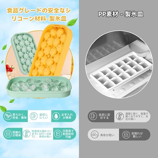 【数量が多く·かわいい形状】アイスキューブトレーは、黄色と緑の2つの異なる色を組み合わせたセットで、カラーバリエーションが非常に目を引き、夏に最適です。1つのアイストレーで22個ずつ、合計で44個もの氷球を一度に作ることができ、たくさんの氷を簡単に楽しむことができます。氷球の直径は約28mmで、製氷皿のサイズは20cm×13cm×3.8cm。コンパクトなサイズで、小型の冷蔵庫や車載冷蔵庫に簡単に収納できます。このシリコーン製のアイストレーはDIY氷塊の理想的なアイテムであり、飲み物愛好者にとって理想的な選択肢です