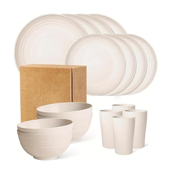 天然の麦わら繊維から作られたこの食器セットは、100% BPAフリーで無毒なので、子供からお年寄りまで、あらゆる年齢層に最適です。従来のプラスチックとは異なり、麦わらは持続可能な素材で、品質を損なうことなく健康的な環境を促進します。食器があなたとご家族にとって安全であることをご安心ください。</br> あらゆる食事に使える完全なセット</br> この16ピースセットは4人分のサービスを提供します。</br> 内容:</br> - ディナープレート 4枚</br> - デザートプレート 4枚 - ボウル 4枚</br> - カップ 4枚</br>