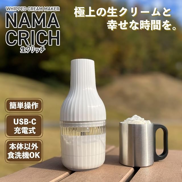 生クリッチ【材質】本体、中蓋/ABS樹脂 カップ/AS樹脂 ウィスク/18-8ステンレススチール、ポリアセタール アダプター上下/ポリアセタール パッキン/シリコーンゴム 【サイズ】直径87×196mm 【重量】390g(USB充電ケーブルを除く) 【電源】充電式USB Type-C(5V-1A)専用USB充電ケーブル使用 【バッテリー】リチウムイオンバッテリー 3.7V 2600mAh【充電時間】約3時間【泡立て可能容量】100ml【定格時間】4分 【生産国】中国 食洗機対応(本体以外)