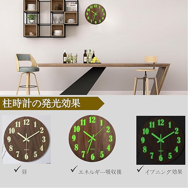 商品名:直径30cm壁掛け時計 木製 夜光 掛け時計 静音 おしゃれ 連続秒針 時計 壁掛け ウッド 時計 蛍光 暗くなると自動で光る時計 自宅 寝室 オフィス インテリア かけ時計